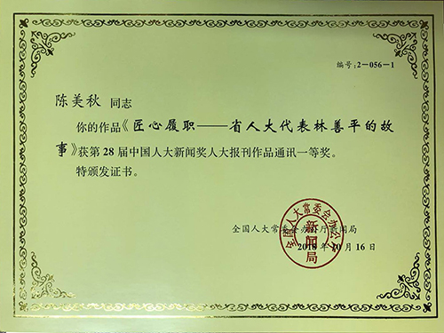 《匠心履職——省人大代表林善平的故事》獲得28屆中國(guó)人大新聞獎(jiǎng)人大報(bào)刊作品通訊一等獎(jiǎng)