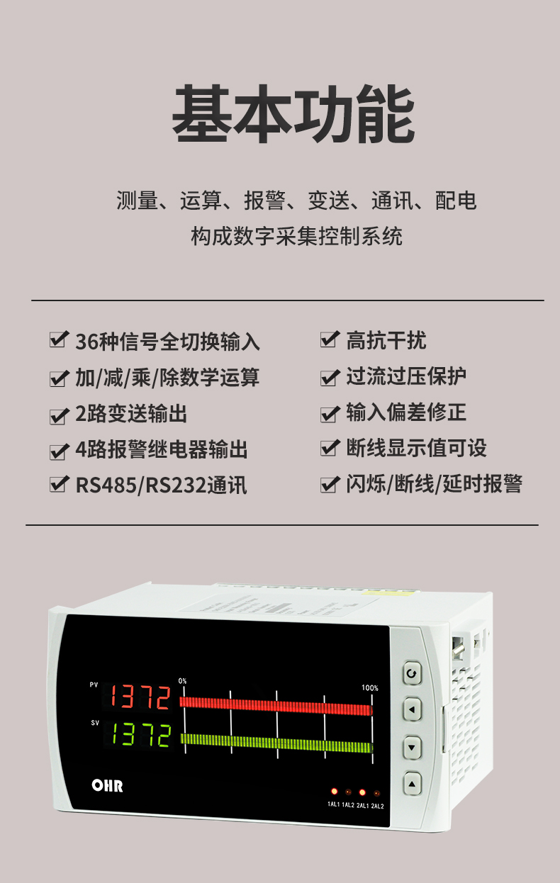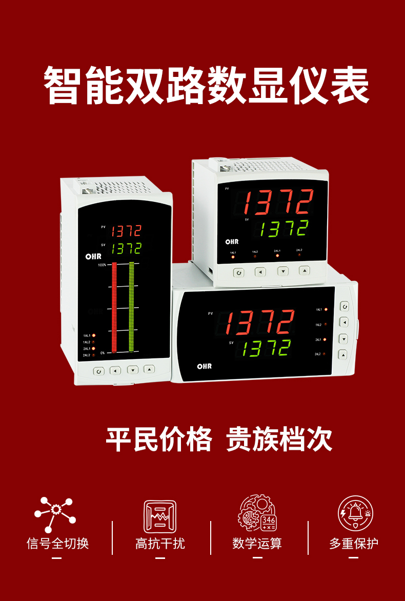 OHR-E200系列雙回路數(shù)字顯示控制儀針對現(xiàn)場溫度、壓力、液位、速度等各種信號進(jìn)行采集、顯示、控制、遠(yuǎn)傳、通訊、打印等處理,構(gòu)成數(shù)字采集系統(tǒng)及控制系統(tǒng),廣泛運(yùn)用于電力、石化、冶金、輕工、制藥、航空等諸多領(lǐng)域。