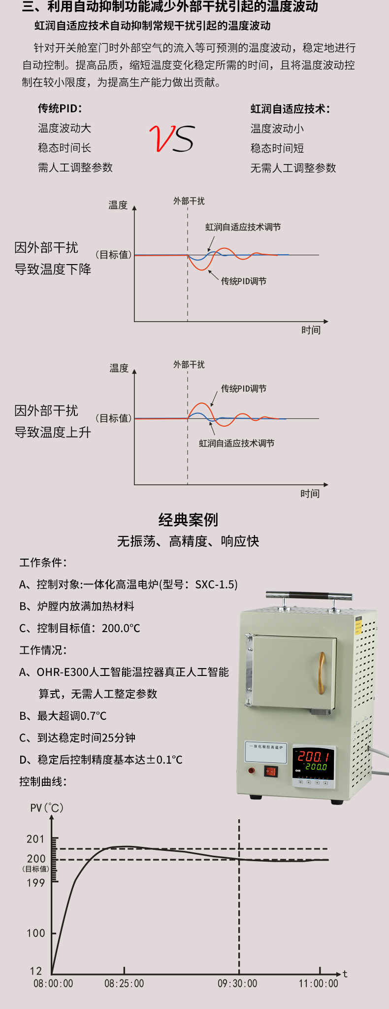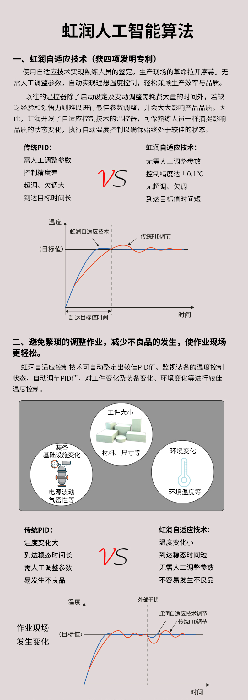 虹潤公司是專業(yè)生產(chǎn)溫控器的國家專精特新“小巨人”企業(yè)。生產(chǎn)的人工智能溫控器,具有真正人工智能算式,無需人工整定參數(shù),控制精度可達±0.1°C,多種輸出類型,高抗干擾等特點。產(chǎn)品獲得模糊PID控制儀及控制方法、人工智能調節(jié)器、智能化控制器、移相觸發(fā)控制器、閥門自動手動無擾動操作控制方法及裝置等5項國家發(fā)明專利,主持起草物聯(lián)網(wǎng)智能溫度儀表通用技術條件、工業(yè)過程控制系統(tǒng)用模擬輸入兩位或多位輸出儀表、工業(yè)過程測量和控制系統(tǒng)用智能調節(jié)器等3項國家標準,參與國際5G標準制定,取得模糊PID溫控儀等3項相關軟件著作權。產(chǎn)品廣泛應用于電力、石化,冶金、制藥、食品等幾乎所有工業(yè)現(xiàn)場,實現(xiàn)精準控溫,保障生產(chǎn)安全與質量。