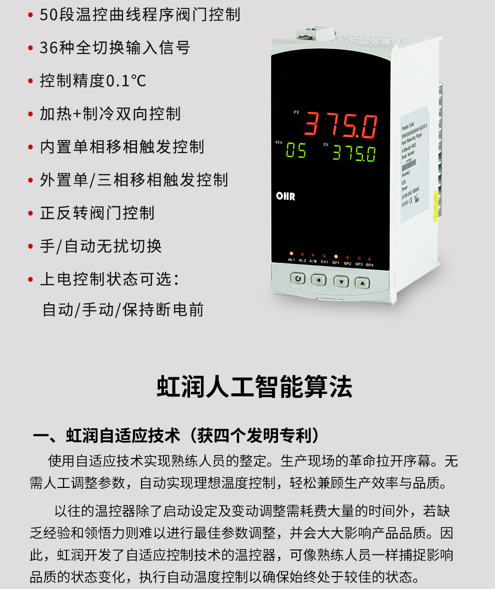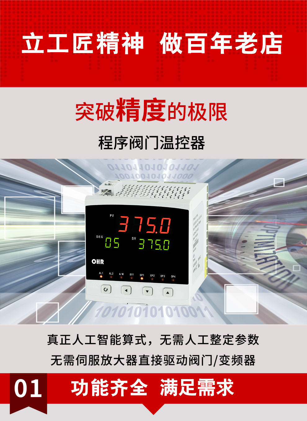 OHR-E401系列程序閥門溫控器/調(diào)節(jié)儀采用真正的人工智能算式,儀表啟動(dòng)自整定功能,可以根據(jù)被控對象的特性,自動(dòng)尋找最優(yōu)參數(shù)以達(dá)到很好的控制效果,無需人工整定參數(shù)。控溫精度基本達(dá)±0.1℃,無超調(diào)、欠調(diào),達(dá)國際先進(jìn)水平。