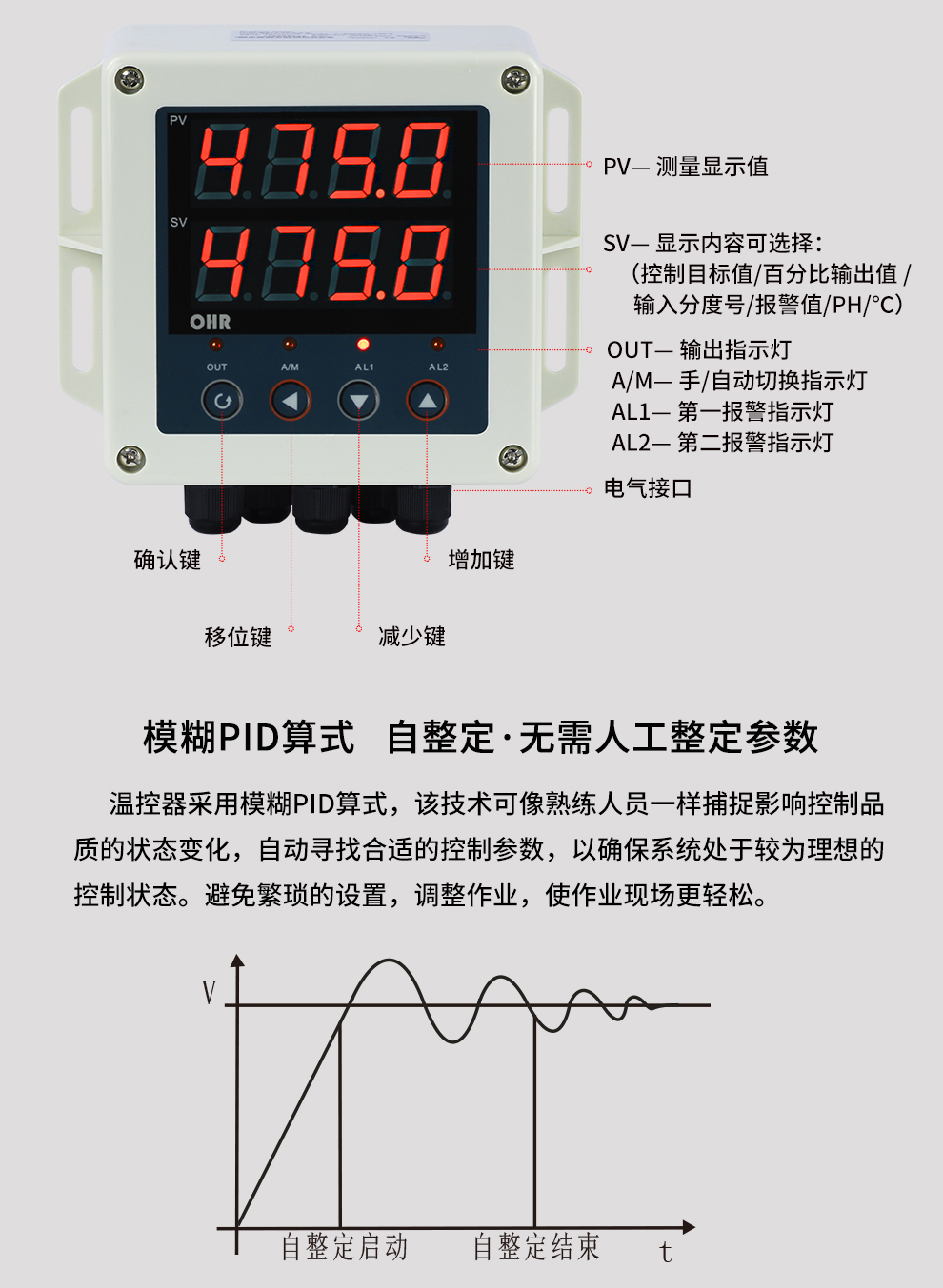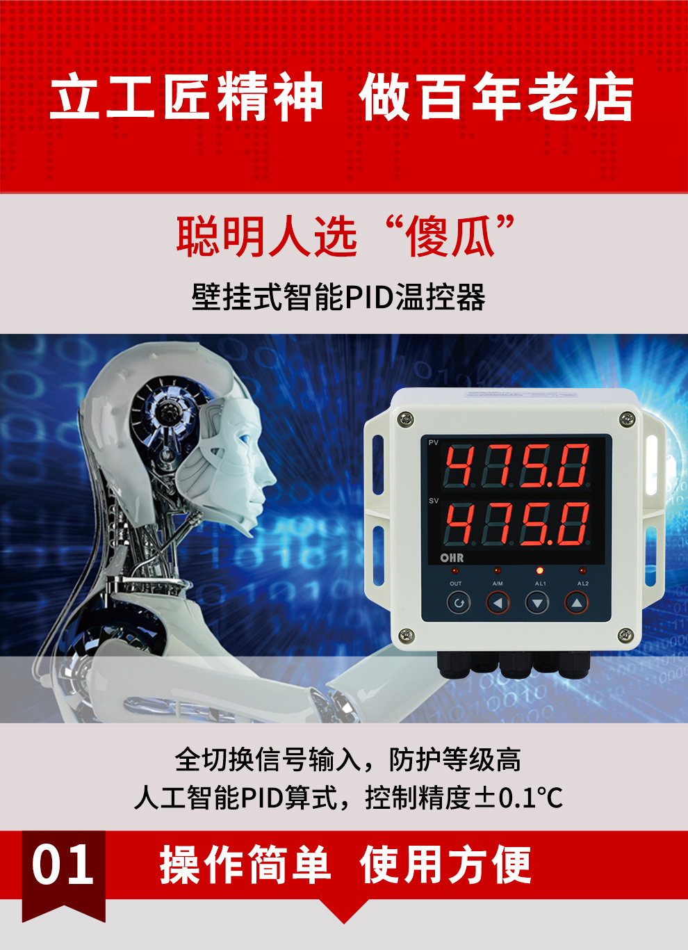 OHR-BG30/BG40系列壁掛式智能溫控器/60段程序溫控器采用了表面貼裝工藝,全自動貼片機生產(chǎn),具有很強的抗干擾能力。本儀表采用人工智能算式,儀表啟動自整定功能,可以根據(jù)被控對象的特性,自動尋找參數(shù)以達到很好的控制效果,無需人工整定參數(shù),控溫精度基本達±0.2℃,無超調、欠調,性價比高。