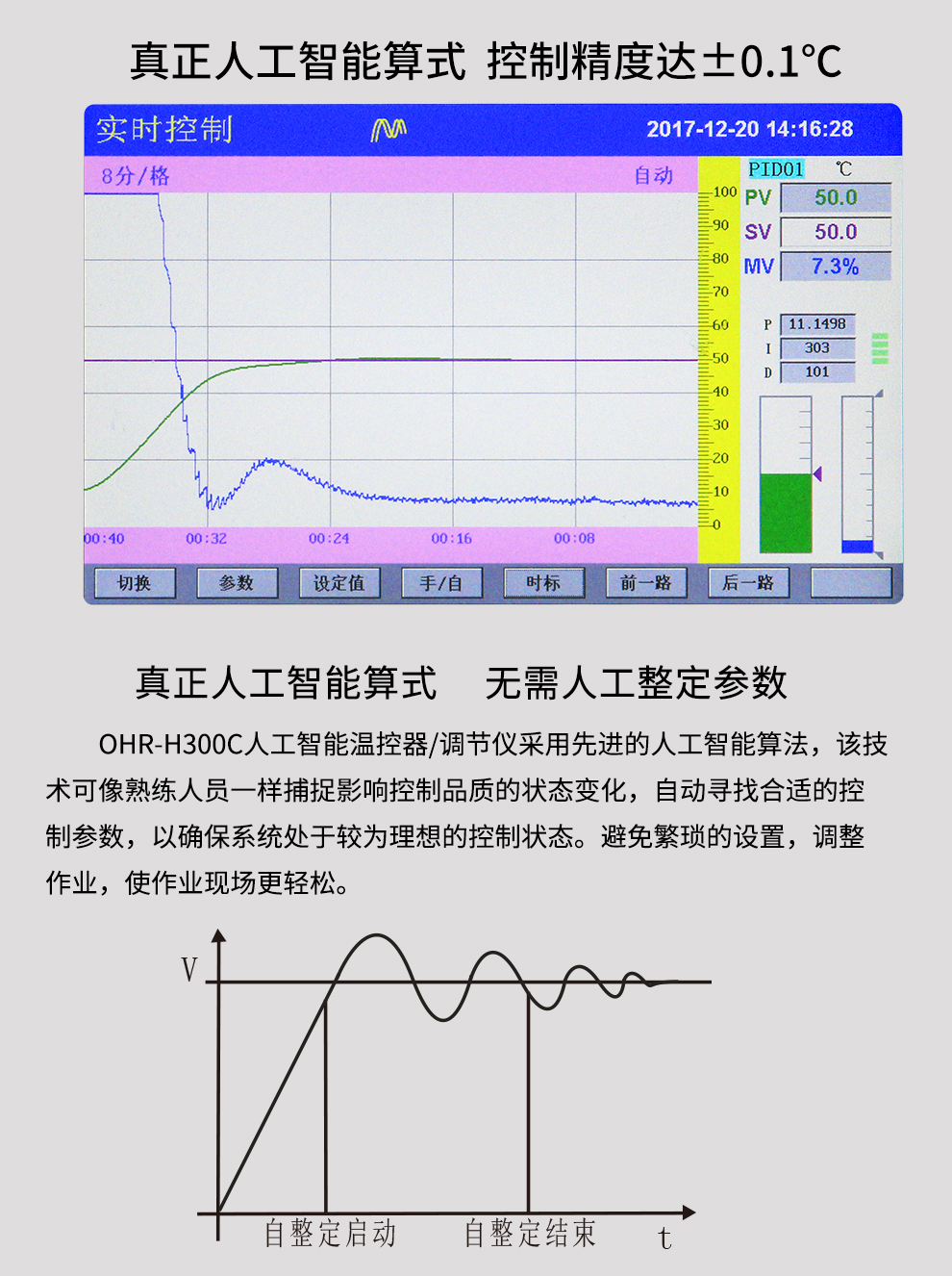 OHR-H300C系列觸摸式溫控器采用真正的人工智能算式,儀表啟動(dòng)自整定功能,可以根據(jù)被控對(duì)象的特性,自動(dòng)尋找最優(yōu)參數(shù)以達(dá)到很好的控制效果,無(wú)需人工整定參數(shù)??販鼐然具_(dá)±0.1℃,無(wú)超調(diào)、欠調(diào),達(dá)國(guó)際先進(jìn)水平。24路萬(wàn)能輸入(可組態(tài)選擇輸入:標(biāo)準(zhǔn)電壓、標(biāo)準(zhǔn)電流、熱電偶、熱電阻、毫伏等)其中可帶8路控制輸入。