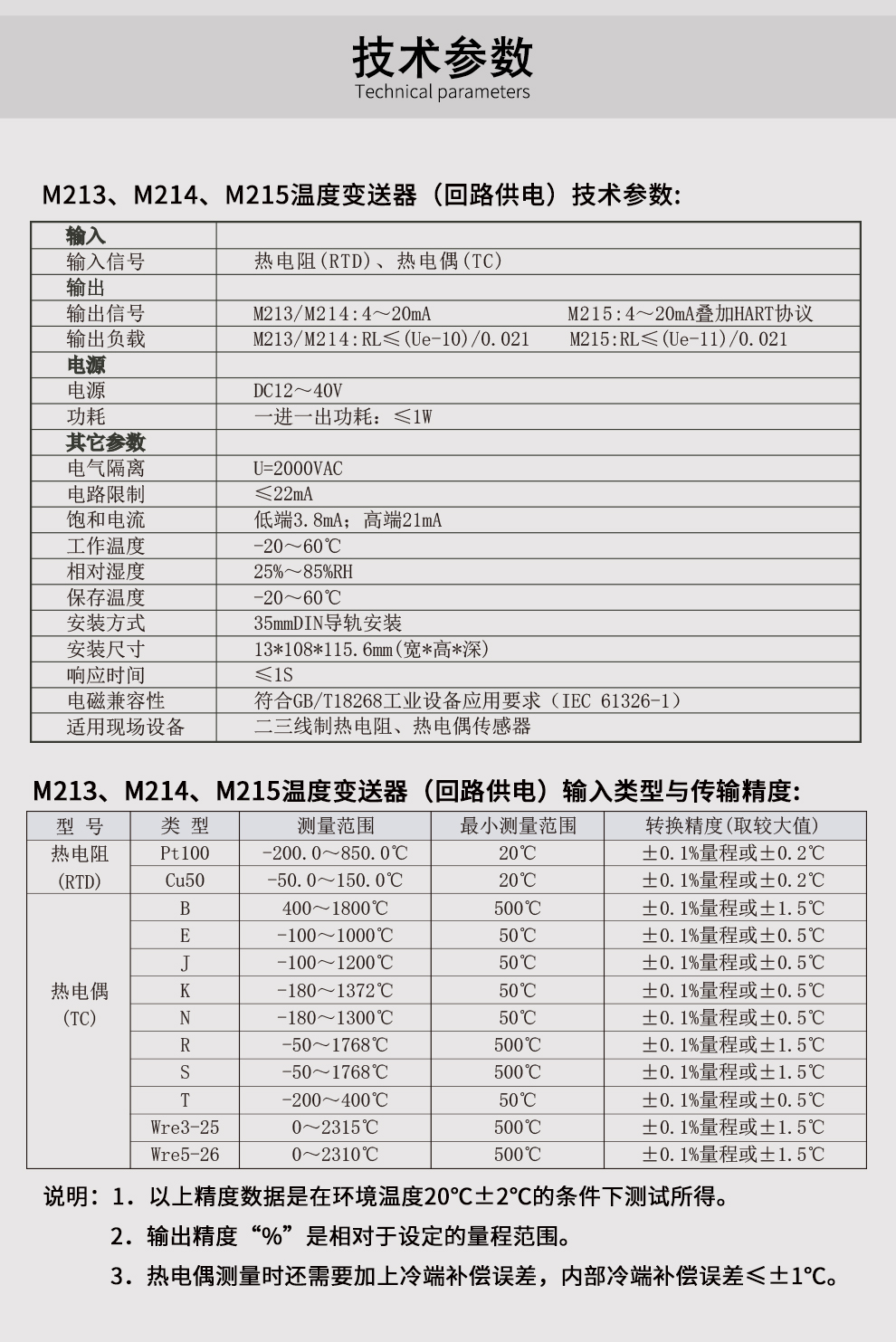 回路供電溫度變送器分為M213智能溫度變送器、M214隔離智能溫度變送器、M215 HART智能溫度變送器,變送器將現場的熱電阻或熱電偶信號經過隔離放大處理,轉換為與溫度成線性的二線制4-20mA(HART)信號輸出至控制系統。