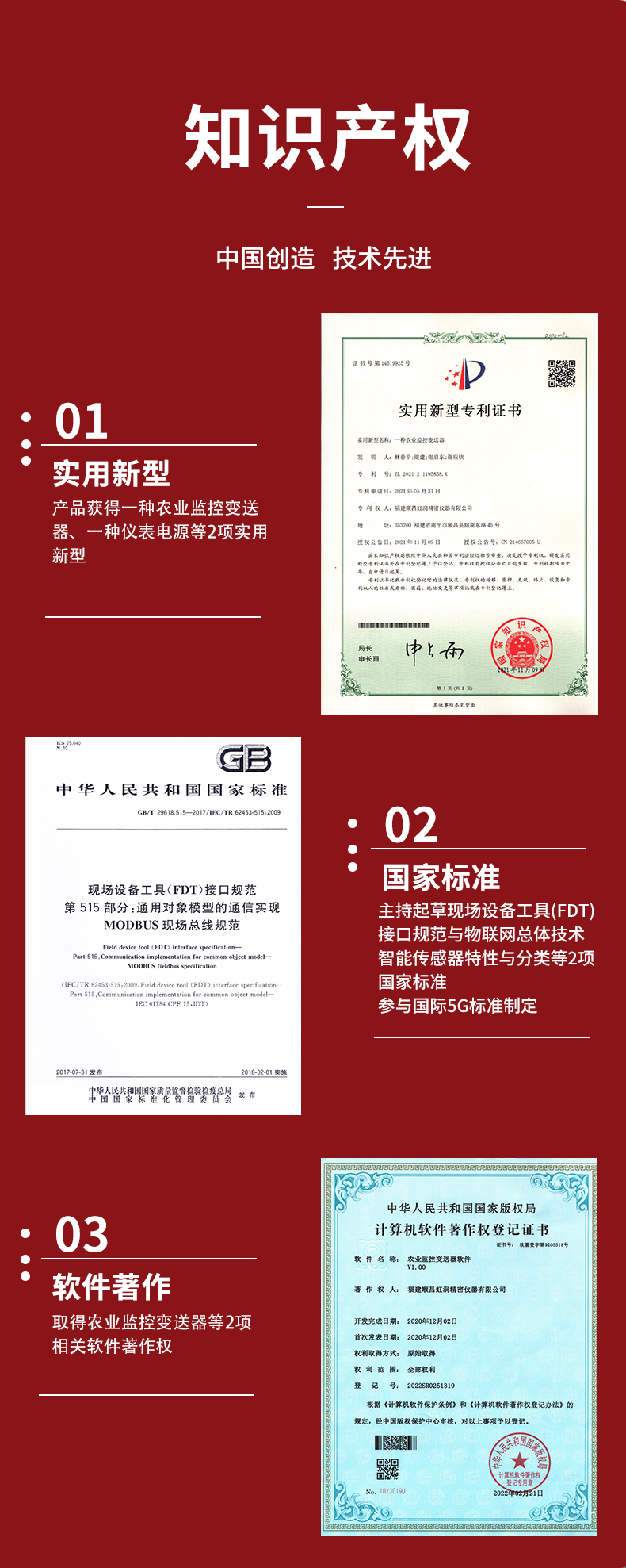 虹潤公司是專業生產環境監測儀表的國家專精特新“小巨人”企業。生產的光照變送器,具有高精度感光傳感器,響應靈敏,準確度高,低功耗,模擬量變送輸出或RS485通訊等特點。產品獲得一種農業監控變送器、一種儀表電源等2項實用新型專利,主持起草現場設備工具(FDT)接口規范、物聯網總體技術智能傳感器特性與分類等2項國家標準,參與國際5G標準制定,取得農業監測變送器等3項相關軟件著作權。產品廣泛應用于溫室大棚、花卉養殖、科研實驗、智能樓宇、戶外照明等環境場合對光照度的檢測。