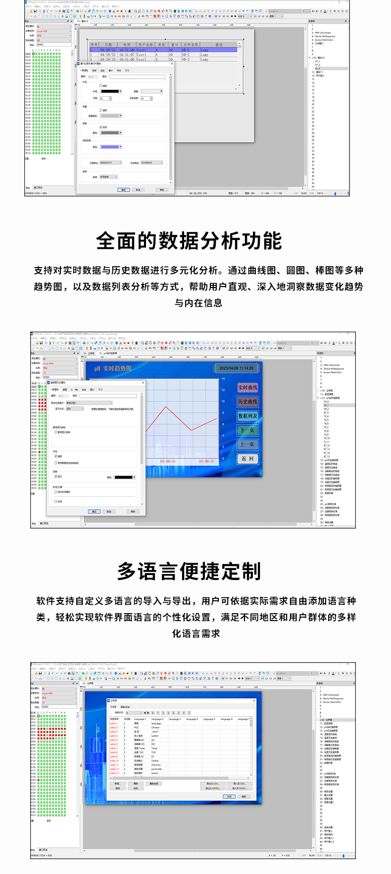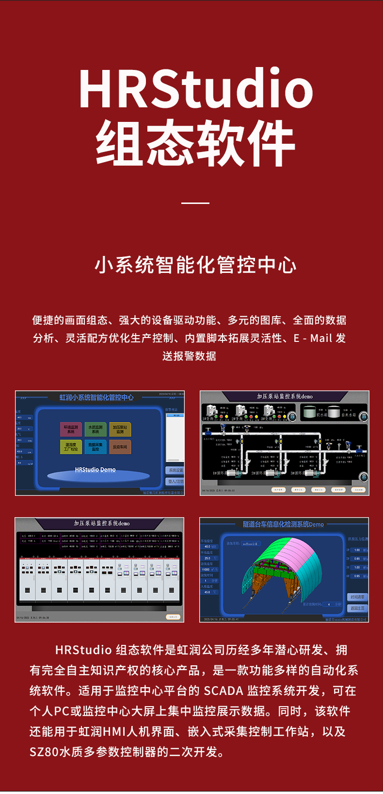 HRStudio 組態軟件是虹潤公司歷經多年潛心研發、擁有完全自主知識產權的核心產品,是一款功能多樣的自動化系統軟件。適用于監控中心平臺的 SCADA 監控系統開發,可在個人 PC 或監控中心大屏上集中監控展示數據。同時,該軟件還能用于虹潤 HMI人機界面、嵌入式采集控制工作站,以及SZ80 水質多參數控制器的二次開發