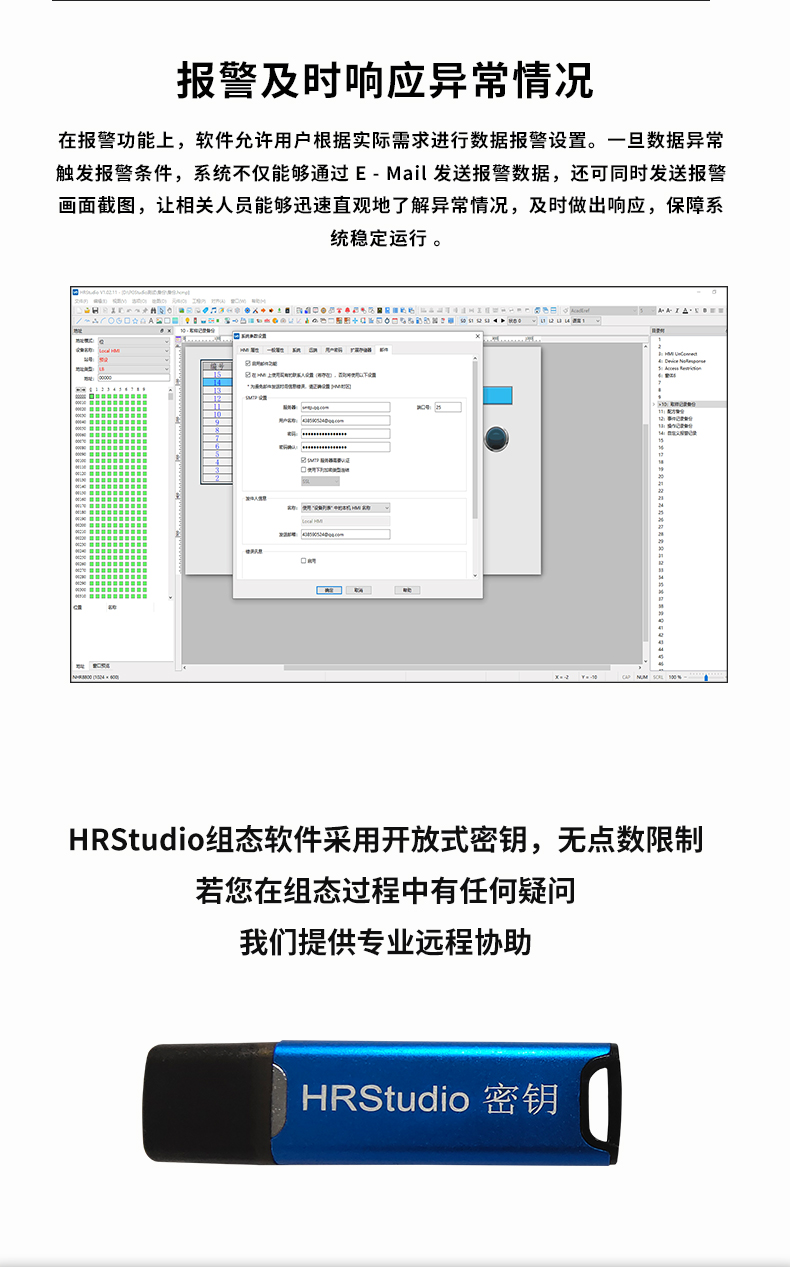 虹潤?HRStudio?組態軟件采用開放式密鑰,無點數限制;凡購買虹潤帶有 RS485/232、以太網通訊功能的儀表,單筆訂單滿 3800 元,即免費贈送HRStudio 組態軟件及對應密鑰;若您在組態過程中有任何疑問,我們提供專業遠程協助。